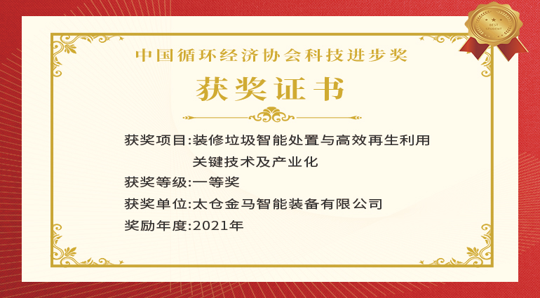 金馬裝備榮獲“中國循環(huán)經(jīng)濟(jì)協(xié)會科學(xué)技術(shù)獎一等獎”